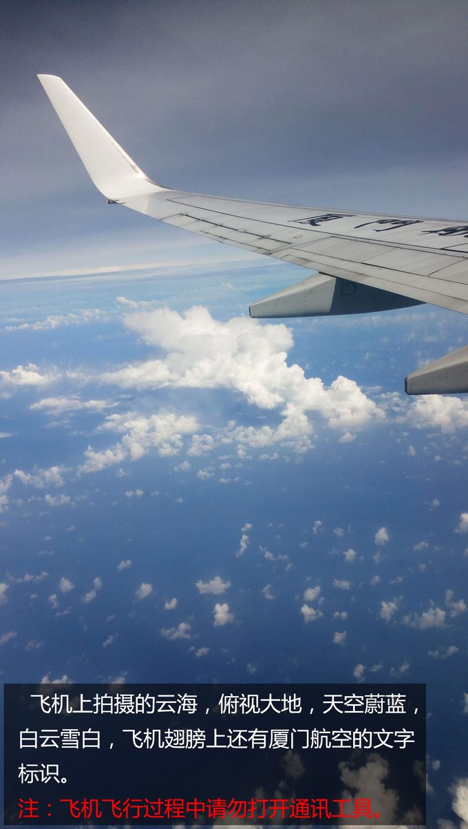 飛機上拍攝的云海,俯視大地,天空蔚藍,白云雪白,飛機翅膀上還有廈門航空的文字標(biāo)識。注:使用相機拍攝,飛機飛行過程中請勿打開通訊工具。