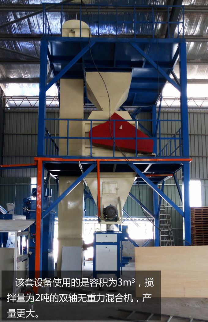 該套設(shè)備使用的是容積為3m3,攪拌量為2噸的雙軸無重力混合機,產(chǎn)量更大。
