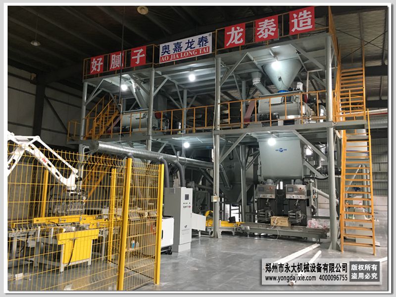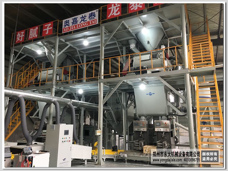 自動碼垛膩子粉生產(chǎn)線是鄭州永大機械根據(jù)膩子粉的特性精心設計的,使用雙軸無重力混合機為生產(chǎn)主機,通常單套設備年產(chǎn)量2-3萬噸,主要由:原料存儲系統(tǒng)、自動配料系統(tǒng)、混合系統(tǒng)、自動包裝系統(tǒng)、自動碼垛系統(tǒng)及除塵系統(tǒng)等構(gòu)成??梢杂糜谏a(chǎn)內(nèi)外墻膩子、柔性膩子、石膏膩…